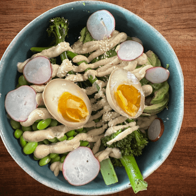 Black rice • Soy-stained jammy-egg • Avocado • Edamame beans • Broccolini • Radish • Coriander • Miso cashew dressing