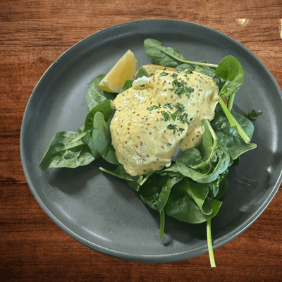 Poached eggs • Baby spinach • Sourdough • Hollandaise • Add your favourite protein (ham, smoked salmon or slow roasted tomatoes)