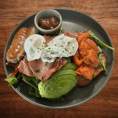 Pork sausage • Bacon • Eggs • Herb tomatoes • Avo • Sourdough • Relish