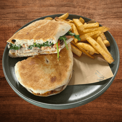 Pulled chicken • Tasty cheese • House made pesto • Mayo • Spinach • Your choice of Turkish bread or tortilla parcel. Pictured in Turkish bread, with a side of chips.