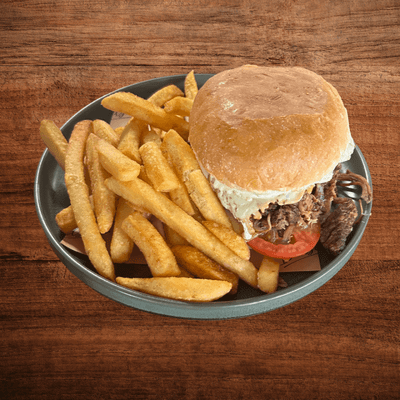 18 hour pulled brisket • Caramelised onion • Tomato • Aioli • Tasty Cheese • Lettuce • Hot chips