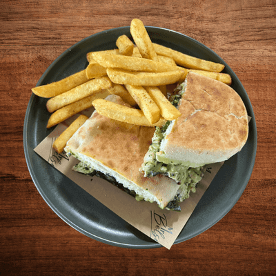 Beef • Tomato • House relish • Blue cheese sauce • Spinach • Your choice of Turkish bread or tortilla parcel. Pictured in Turkish Bread, with a side of hot chips.