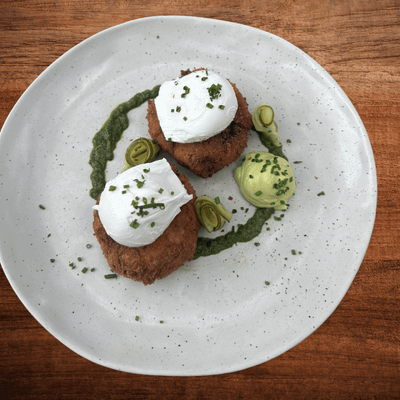 Sweet potato & corn croquettes • 2 poached eggs • Herb mayo • Pickled cucumber • Green dressing (GLUTEN FREE)